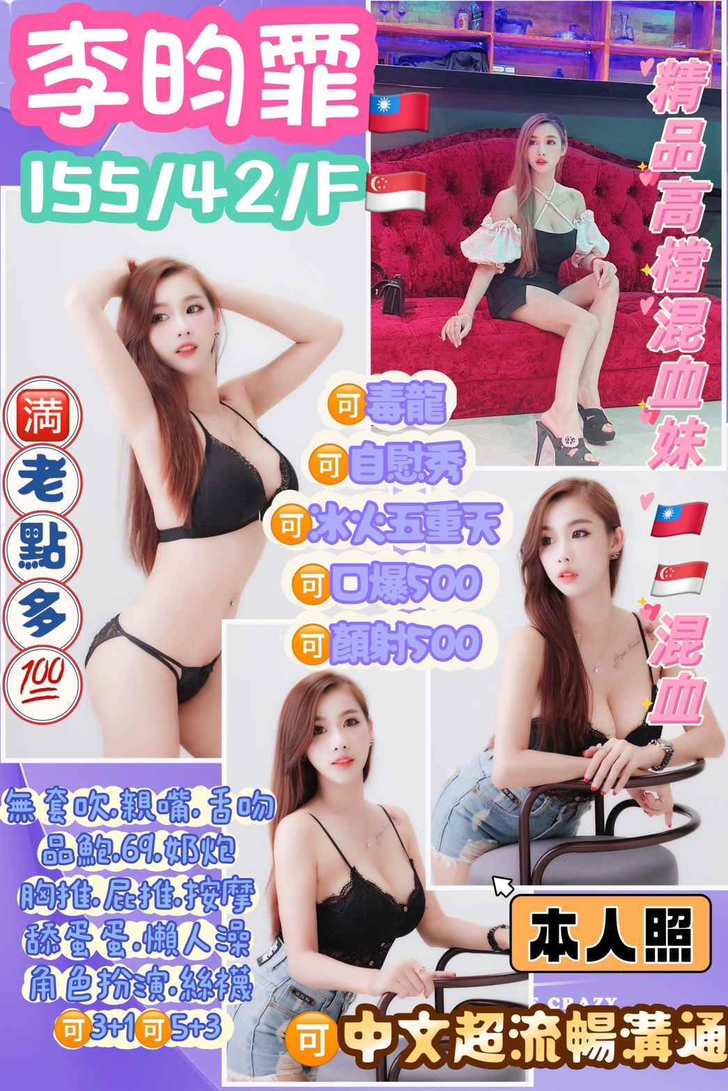 無套吹//親嘴舌吻(嘴巴乾淨清潔)/品鮑/69/奶炮胸推(需先告知)/按摩/懶人澡/舔蛋蛋(需先告知)/屁推(需先告知)/絲襪角色扮演(需自備)/毒龍(需先告知)/自慰秀(需先告知)/冰火五重天(需先告知)/顏射+500/口爆+500/可3+1/可5+3